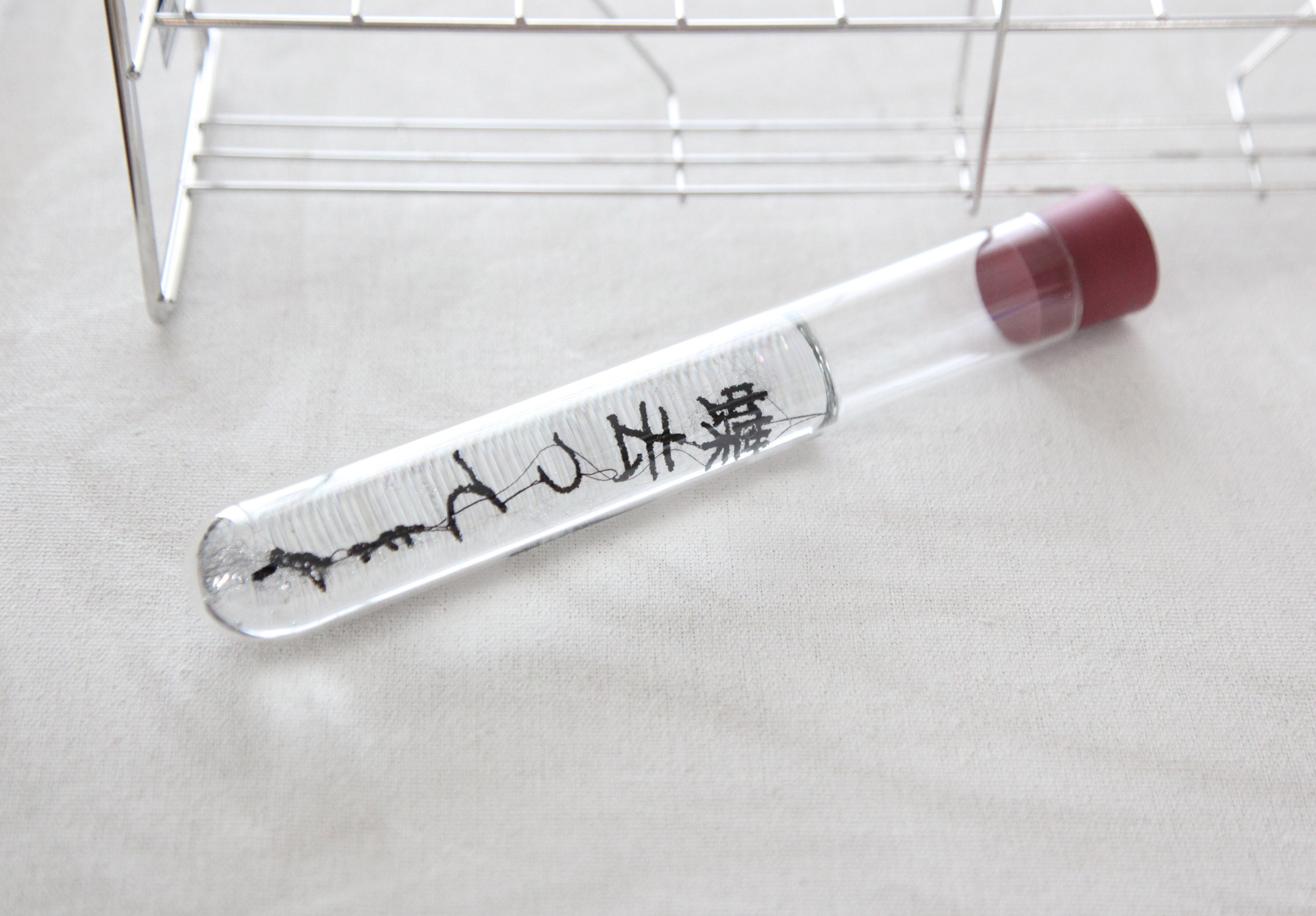 直径30ミリ高さ200ミリのガラス試験管にコトノハの欠片を樹脂で閉じ込めゴムの栓をしたオブジェです。(栓まで含めるとおよそ21〜21.5センチの高さ)コトノハそのものは糸でできていて、無数の気泡を含んでいます。ワイヤースタンドはついていません。