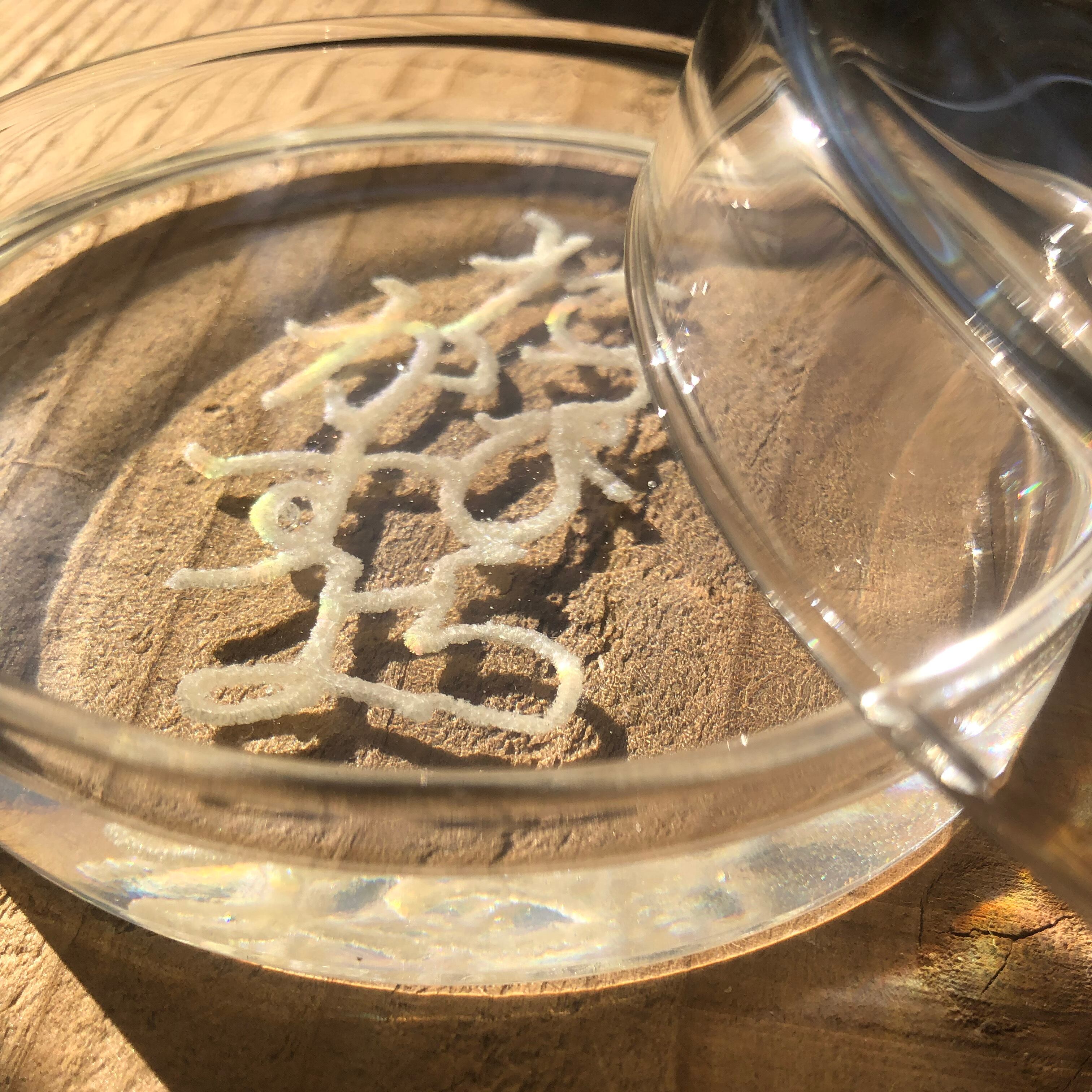 90mm∅ガラスシャーレの中にコトノハの欠片を樹脂で閉じ込めています。